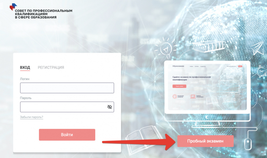 - До регистрации можно пройти пробный экзамен, пройдя по ссылке из пункта